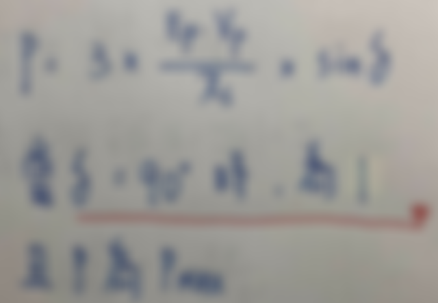 39.當圓柱式同步發電機的輸出功率Po為最大輸出時,負載角δ應為多少?