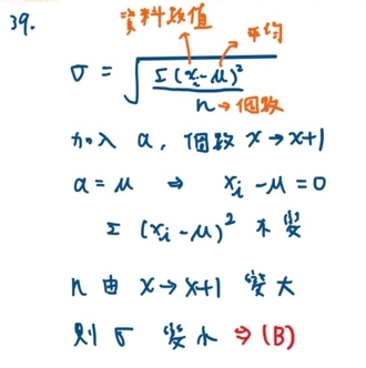 39.若在一組數據資料中加入一個新的數據 A,且 A 恰好是原數據資料的平均數。請問加入新資料 A 後,全部數據資料的標準差會有什麼