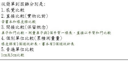 一般測量概念是依循直接比較、間接比較、個別單位比較、到普遍單位比較的架構發展。