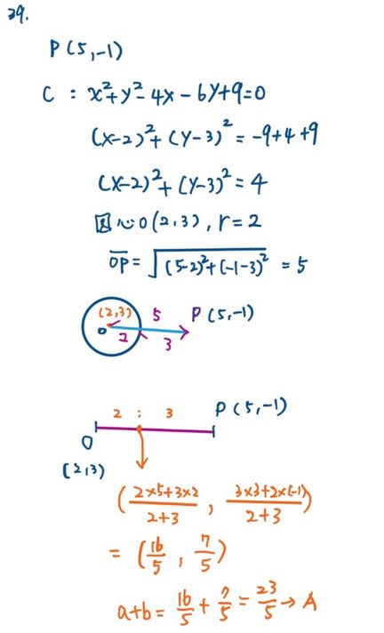 39. 已知平面上有一點P(5,-1)且圓C:x 2+y 2-4x-6y+9=0,若圓C上與P最近的點之座標為(a,b),則a+b之值為何?