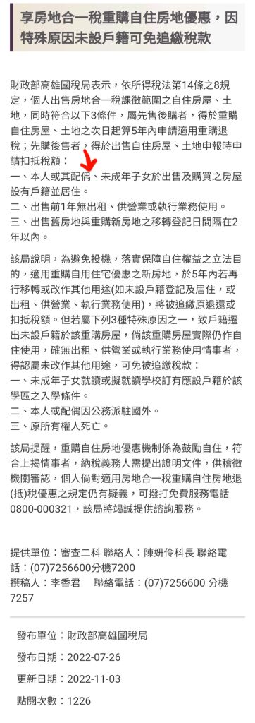 (A)出售前 1 年須本人或其配偶、未成年子女設有戶籍並居住,且無出租、供營業或執行業務使用