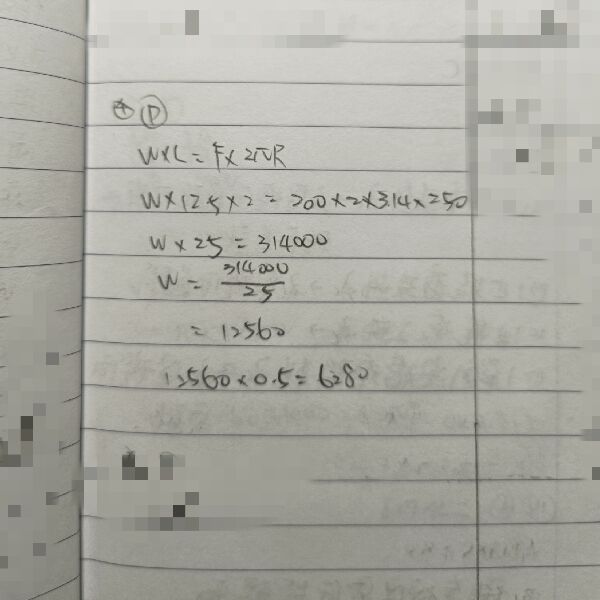 螺距P=12.5 mm 之雙線螺紋螺桿n=2、手柄長R=250 mm 的螺旋起重機,若摩擦損失為η=50%,今施以W=200 N 力於手柄上