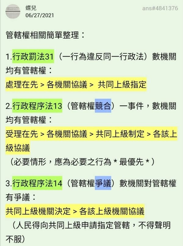 行政程序法第14條:數行政機關於管轄權有爭議時,由其共同上級機關決定之,無共同上級機關時,由各該上級機關協議定之。