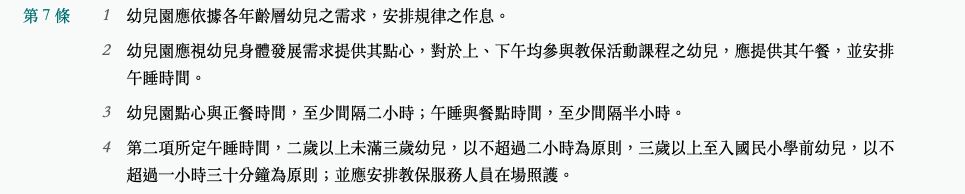 幼兒園點心與正餐時間,至少間隔二小時;午睡與餐點時間,至少間隔半小時。