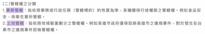 (2) 土地管轄:指事物管轄所涵蓋之地理範圍,中央以全國為範圍;地方機關以縣市、鄉鎮市等為範圍。