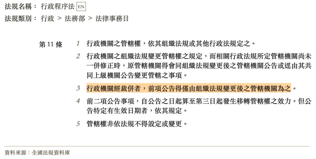 —>行程§11Ⅲ 行政機關經裁併者,得僅由組織法規變更後之管轄機關,公告變更管轄事項。
