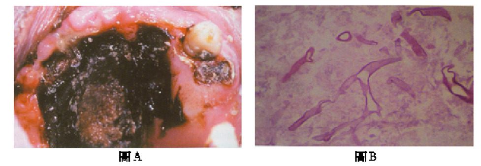 4.一位60歲女性上腭出現組織壞死及黑色膿液流出(圖A),急診驗血及生化檢驗發現血糖值過高,顯示糖尿病控制不良及酮酸中毒現象,組織切片鏡檢可見約6~30 μm寬闊之菌絲體(圖B),你的診斷是下列何者?