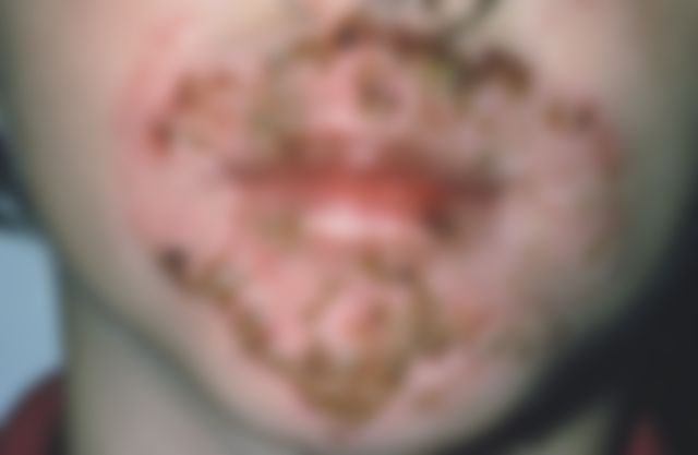 4.一位8歲小孩下臉部出現大水泡狀病灶,破裂後形成淡棕色之薄焦痂(如下圖所示),患者因病灶癢而用手指搔抓,導致鄰近 健康皮膚也因而出現新病灶,經培養發現為金黃色葡萄球菌感染,下列何者為正確之診斷?
