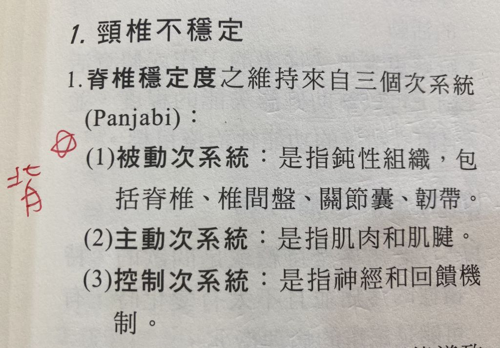 4.根據Panjabi針對脊椎穩定度之維持所提出的次系統控制理論,神經和回饋機制是屬於下列那一個次系統?