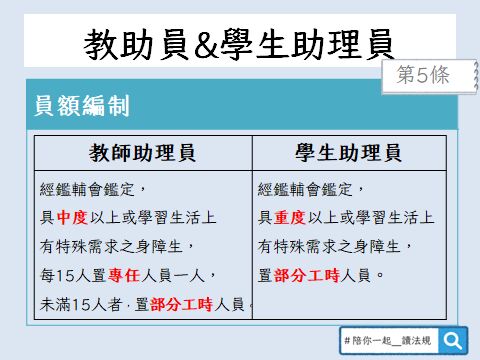 依據---四、教師助理員:經各級主管機關特殊教育學生鑑定及就學輔導會(以下 簡稱鑑輔會)鑑定,具中度以上障礙程度或學習生活上有特殊需求之 身心障礙學生,每十五人置專任人員一人,未滿十五人者,置部分工 時人員。
