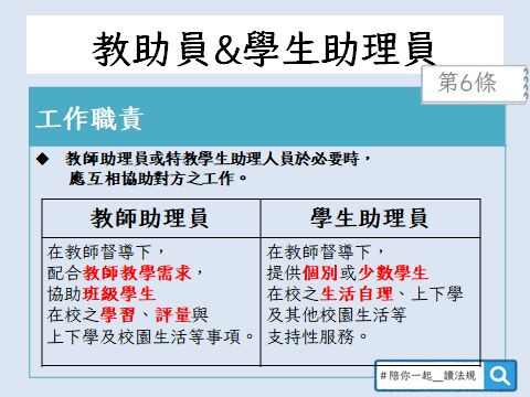 | 第 6 條 | 教師助理員及特教學生助理人員之工作職責、進用資格、進用方式、教育 訓練及督導考核規定如下: 一、工作職責: (一)教師助理員:在教師督導下,配合教師教學需求,協助班級學生在 校之學習、評量與上下學及校園生活等事項。<丁> (二)特教學生助理人員:在教師督導下,提供個別或少數學生在校之生 活自理、上下學及其他校園生活等支持性服務。<丙> |