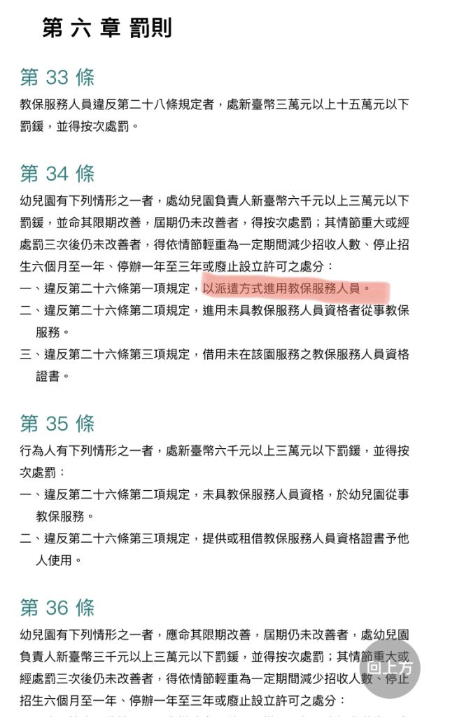 幼兒園有下列情形之一者,應命其限期改善,屆期仍未改善者,處幼兒園 負責人新臺幣三千元以上三萬元以下罰鍰,並得按次處罰;其情節重大或