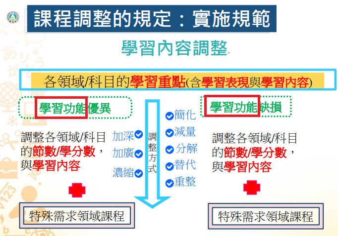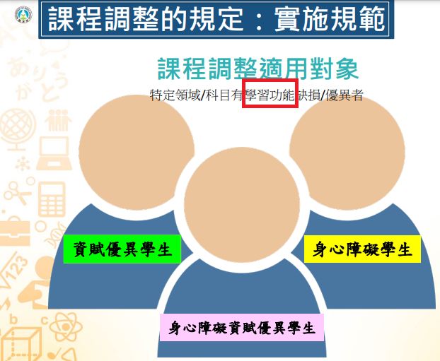 教師應以身心障礙、資賦優異及身心障礙資賦優異學生在每一領域/科目之學習表現作為該領域/科目調整之依據,故本課程實施規範依學生在各領域/科目表現區分為學習功能無缺損、學習功能輕微缺損、學習功能嚴重缺損及學習功能優異,作為本課程實施規範適用對象在特定領域/科目課程規劃及實施之依據。https://sencir.spc.ntnu.edu.tw/GoWeb/include/GetDBfilePDF.php?KeyID=736891591620f405487462-f01