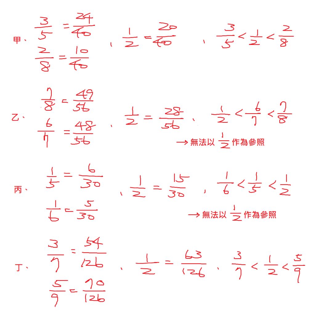4. 老師想布一些「利用參照數比較分數大小」的問題進行教學,有四個布題如下: 甲、比較