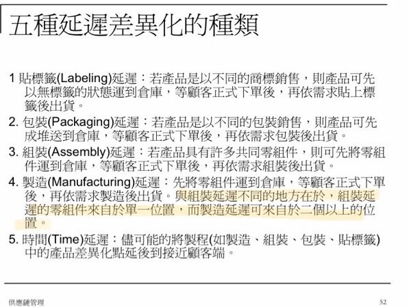 半成品的狀態,再將較具客製化差異的部分,延到顧客訂單確認之後才作業,稱