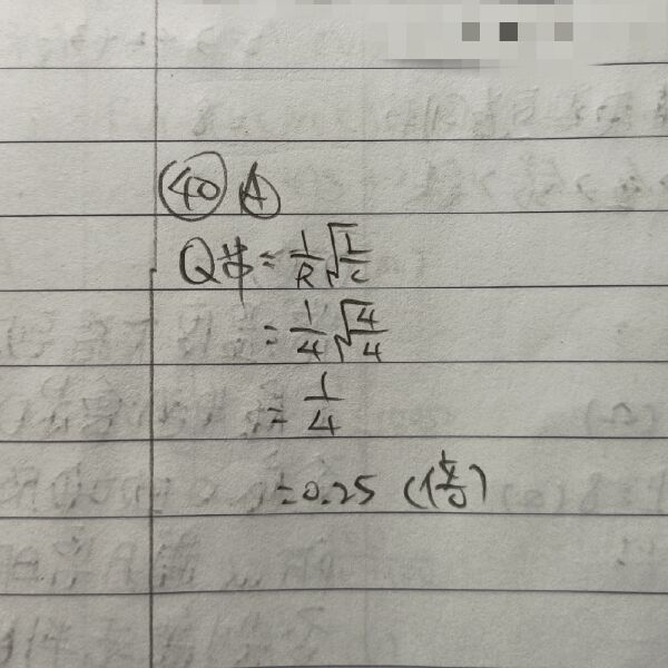40 一品質因數為 Q0的 RLC 串聯諧振電路,如果將R、L及C值同時變為原來的4倍,則新的諧振電路之品質因數將為 Q0的多少倍?