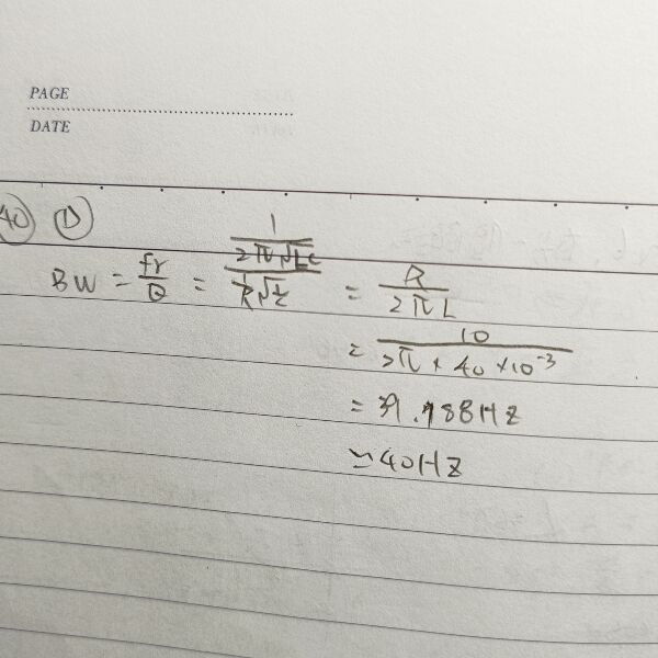 40 如圖所示電路,若電路元件 R=10 Ω,L=40 mH,C=25 μF,則此電路之頻帶寬度 BW 約為多少 HZ?