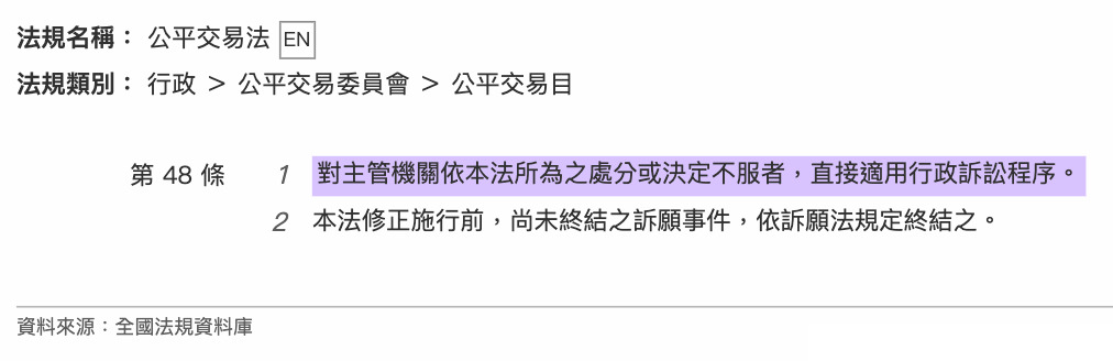 公平交易法 第 48 條 原始資料來源:全國法規資料庫、立法院法學系統