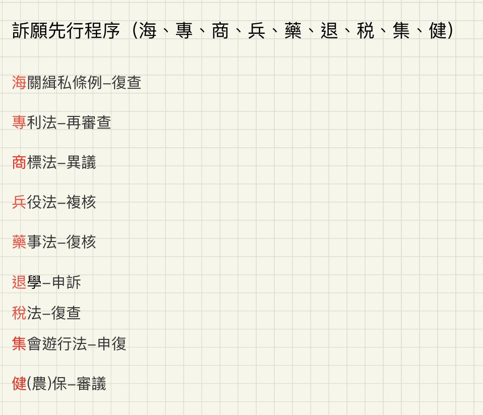 訴願前置:學生申訴,緝私復查,專利再審,兵役復核,藥事復核,全民健保審議,貿易聲明異議,稅捐復查