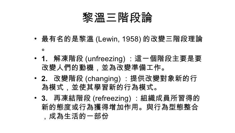 40 組織變革包括解凍(unfreezing)、改變(changing)、再結凍(refreezing)三個階段,下列何者不