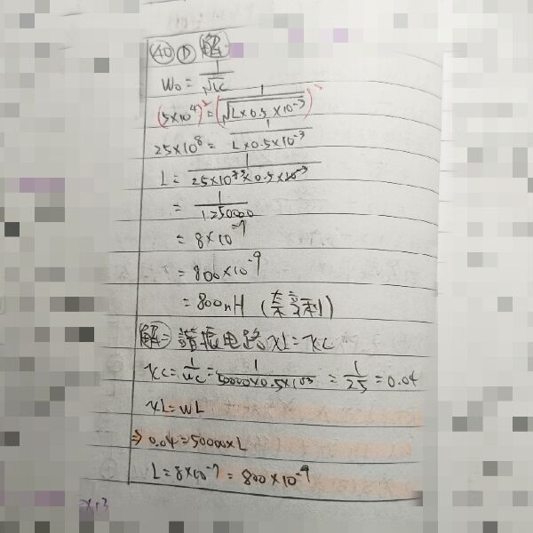 40 RLC 串聯諧振電路中驅動電源 vS=1.5sin(5×104 t+30o )V、R=0.5 kΩ、C=0.5 毫法拉(mF)及流過 R 之電流振幅為 3 mA 時,電感器之電感值 L 應為多少奈亨利(nH)?