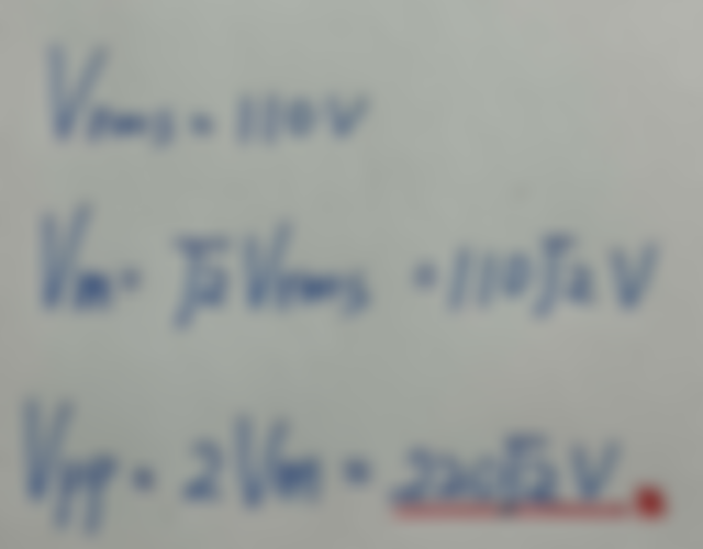 40.以交流電壓表量測交流電路上之交流電壓有效值為110V,試計算其峰對峰值電壓為多少伏特?