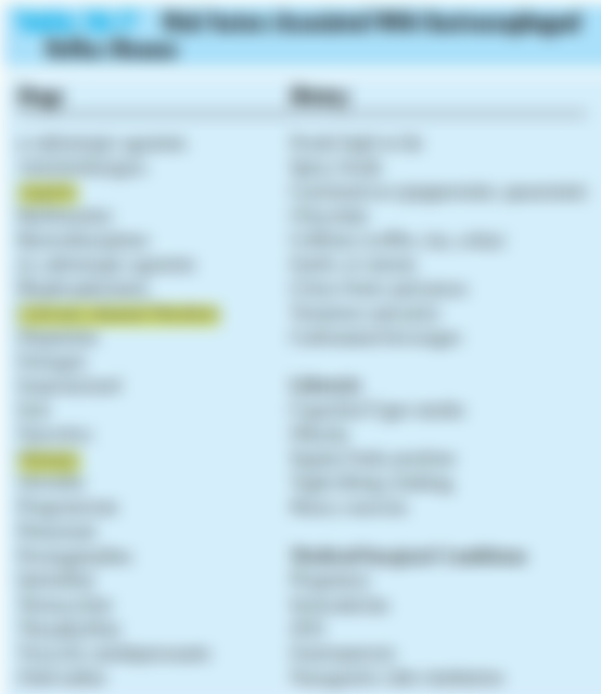- 會降低下食道括約肌壓力的,若可能則避免使用,包括:calcium channel blockers(鈣離子阻斷劑)、β-blockers(乙型受體阻斷劑)、nitrates(硝酸鹽)、theophylline(支氣管擴張劑)。