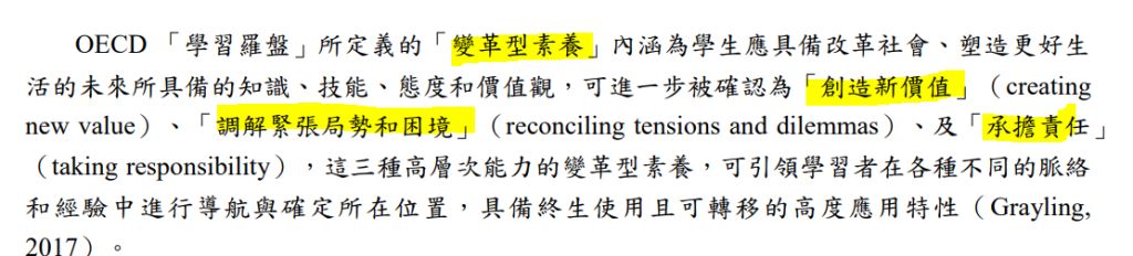 (D) OECD 在 「邁向 2030 年的學習架構」提出「轉型素養」(transformative competencies),其中包含三個