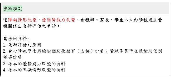前項重新評估,應註明重新評估之原因;身心障礙學生應檢附個別化教育(支持)計畫,資賦優異學生應檢附個別輔導計畫。