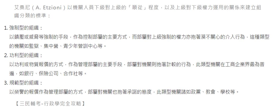 40. 艾桑尼(Etzioni)以上級運用權力和部屬順從方式做為組織分類的基礎,若按照其分類方式,學校機關是屬於下列哪一選項?