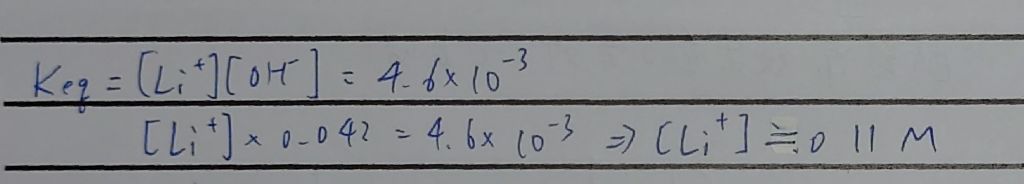 40. LiOH(s) → Li+ (aq) + OH- (aq), Keq = 4.6 × 10-3,反應平衡時[OH- ] = 0.042 M,則[Li+ ] =_____ 。