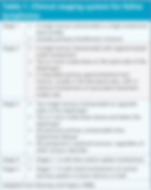 皆完備。理學檢查發現周邊淋巴結大小約3至5公分直徑,胸腹腔放射線學影像正常、超音波檢查發現肝脾腫 大且有結節性混合回音性影像異常、血液及生化檢查正常。此病例之臨床分期為何?