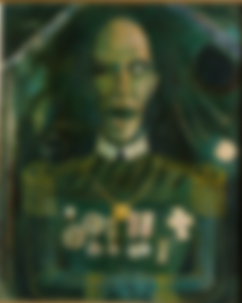 此畫乍看略呈稚味的表現主義幾乎為李氏作品中所罕見,而強烈的政治觀感亦為李氏作品中所僅有。畫中將軍光禿的頭部和肩章使人想起蔣委員長在提倡新生活運動時的照片。我們無法的得知,李氏把這位大聲疾呼、發號施令的將軍畫成此一模樣,是否有感於某一特殊時事,但此畫反應李氏對這位領袖的一般印象,殆無可疑。在繪畫語言上,此畫運用陰慘的藍色調櫬出榮耀之表徵的肩章和胸章,上端往內斜交的橫線則造成近似神龕的區隔。