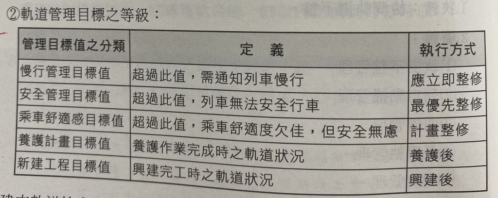 (C)安全管理目標值為最低等級的軌道管理目標值,須優先整修