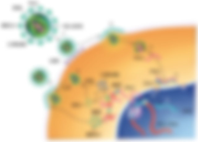 在細胞內,愛滋病毒利用本身特有的反轉錄(reverse transcriptase)將它的遺傳物質(核糖核酸,RNA)反轉錄成去氧核糖核酸(DNA)後嵌入細胞核的DNA中。而後愛滋病毒再利用此DNA轉錄成RNA,製造蛋白質和其它病毒複製所需的物質。待裝配完成後,愛滋病毒顆粒的外套和細胞膜融合,穿過細胞膜。離開前,愛滋病毒顆粒內部的蛋白則繼續工作,將大的蛋白鏈切斷成為許多對愛滋病毒複製很重要的蛋白片斷。整個週期約須2.2天。