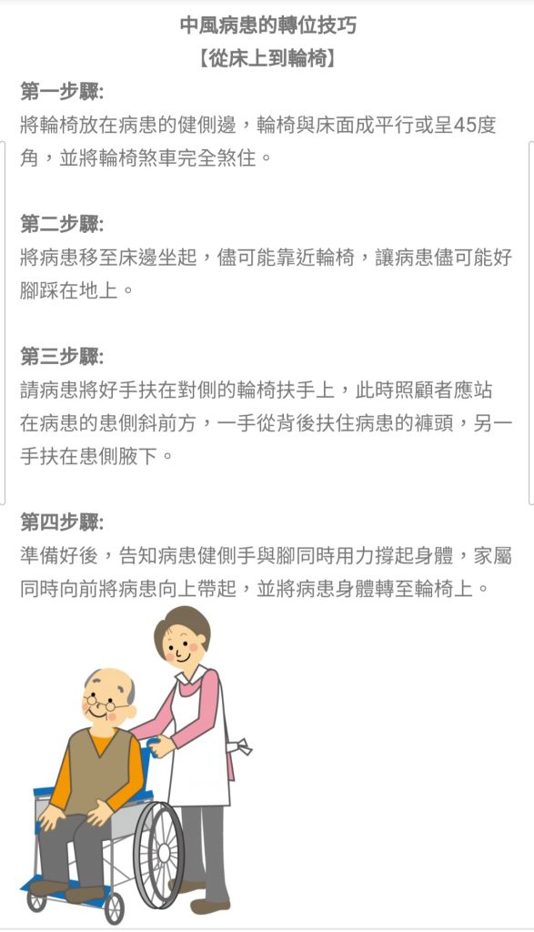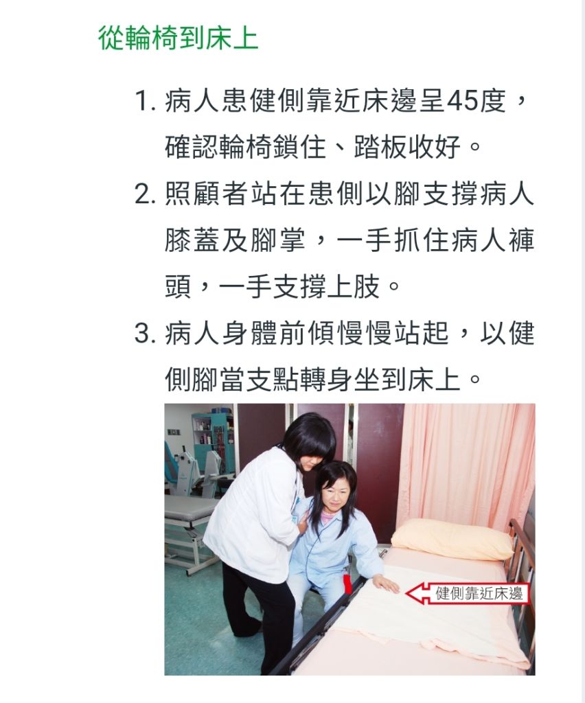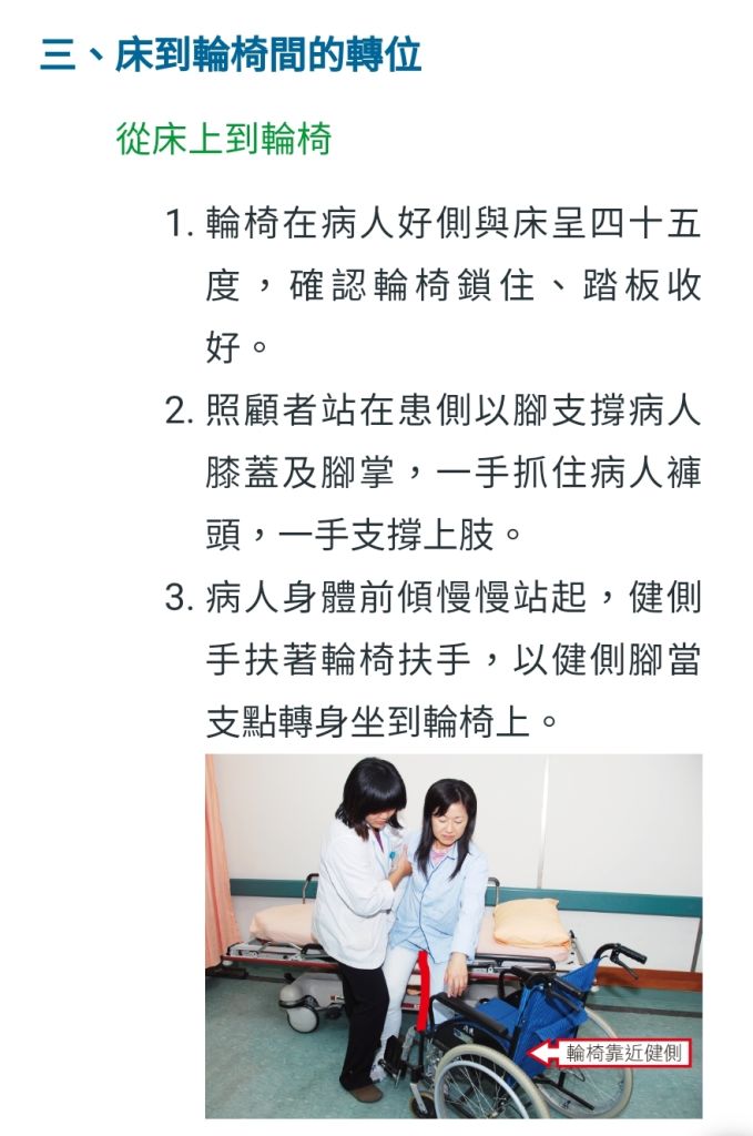 (C)輪椅與床緣應成90度角,且床要比輪椅高