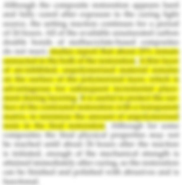(D)複合樹脂充填時表面貼以透明隔片,無法減少未聚合單體(unpolymerized monomer)