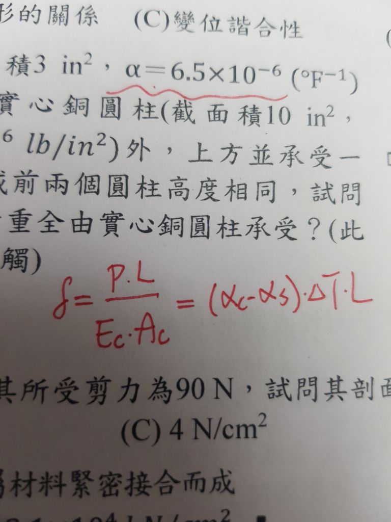 41. 如右圖所示一中空鋼圓柱(截面積 3 in2,α = 6.5 × 10-6(°F-1),E = 30 × 106 lb/in2)圍在一實心銅圓柱(截面積 10 in2,α = 9.3 × 10-6(°F-1),E = 16 × 106 lb/in2)外,上方並承受一 30,000 ݈ܾlb之軸向荷重,假設未加載前兩個圓柱高度相同,試問約需加溫多少才能使加載之軸向荷重全由實心銅圓柱承受?(此時兩柱均與上方不變形鋼體保持接觸)