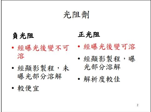 劑和負光阻劑,正型光阻劑經過曝光後,受到光照的部分將