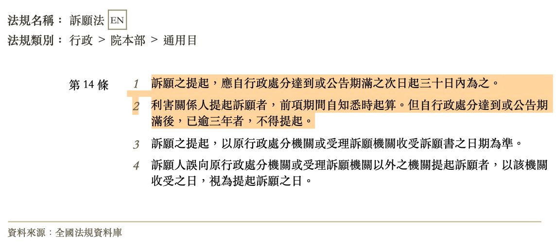 也就是利害關係人要在知道行政處分達到後或公告期滿後三十天內才可以提起訴願。