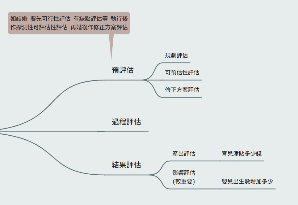 政策執行前、執行中:規劃評估、可評估性評估、修正方案評估