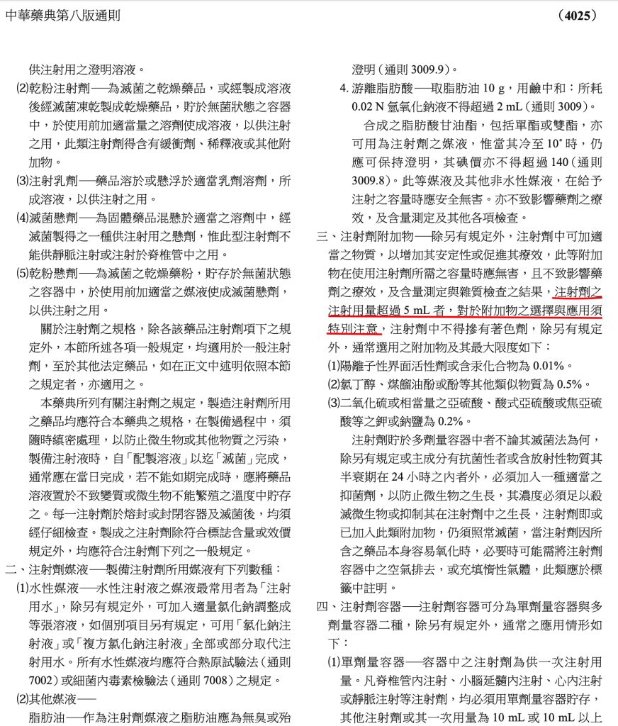 42.依中華藥典規定,注射劑的注射用量超過若干mL時,對於附加物之選擇應予以特別的注意?
