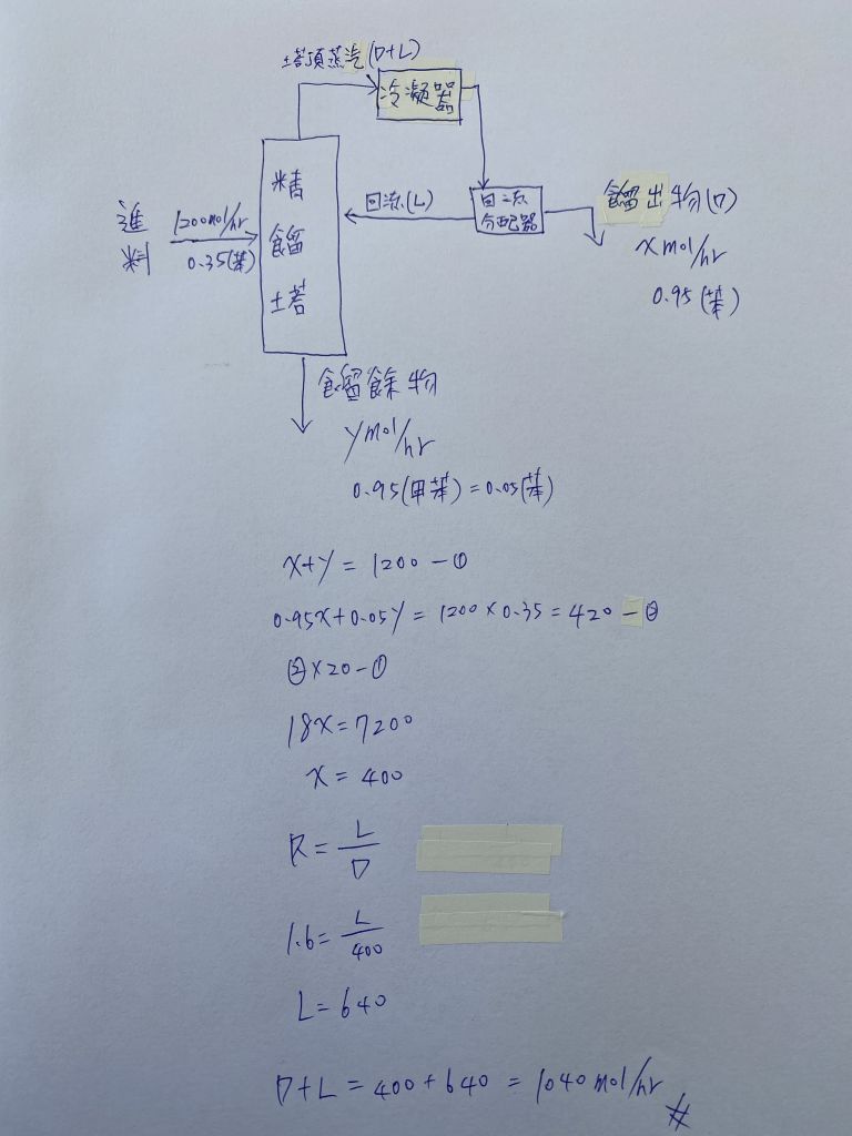 已知回流比為1.6,請問塔頂進入冷凝器中蒸汽流率為多少mol/hr?