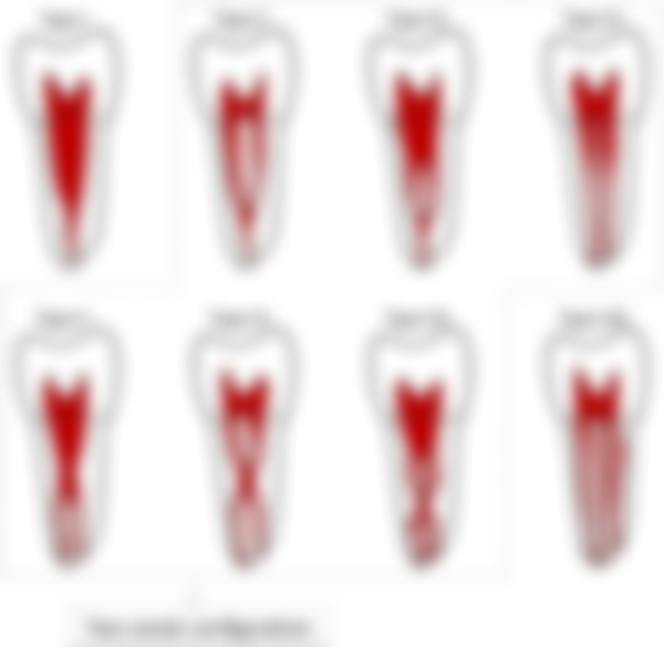 43 一個牙根中的根管依其形態與數目可分為四類。其中,具有兩個分離的根管,這兩個根管在接近根