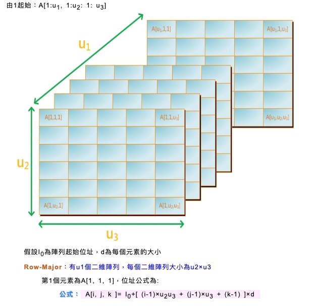 43 因為陣列的資料在記憶體存放的位置是連續的,所以若是知道陣列第一個元素的位址及該陣列每一個元素資料儲存位址的大小(占幾個 byte),就可以根據排放的方式,算出某一個特定元素在記憶體中的位址。假設有一個三維陣列 A[-3:5, -4:2, 1:5],且其起始位置為 A[-3, -4, 1]=100,陣列每一元素占記憶體大小 2 bytes,以列為主排列(Row Major),請計算 A[1, 1, 3]所在的位置?