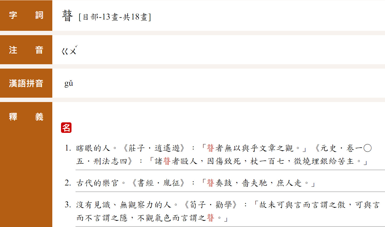 丙:瞽→眼瞎