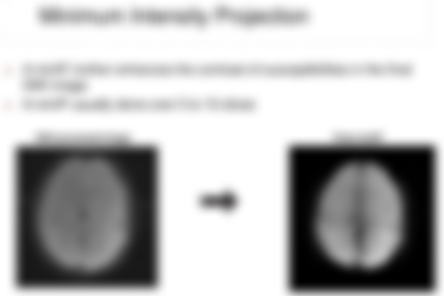 - SWI 是一種對磁敏感性結構(如靜脈)非常敏感的成像技術。MinIP 提取低信號的靜脈影像,是分析大腦靜脈的有效方法。