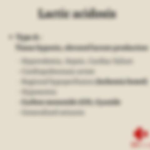 低血容量、敗血症、心臟衰竭、心肺驟停、局部低灌注(腸缺血)、低氧血症、一氧化碳中毒(CO)、氰化物、全身性癲癇