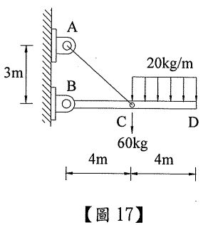 44.承上題【圖17】,BC 桿之軸向力為多少 kg?(A) 180 (壓力)(B) 210 (張力)(C) 240 (壓力)(D) 260 (張力)