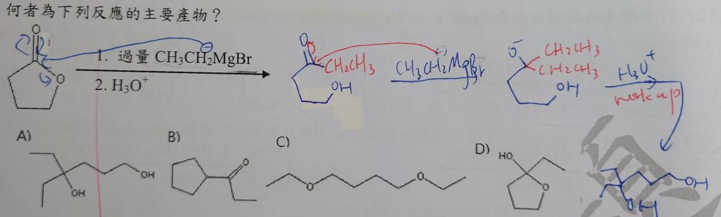 45. 根據下列的反應,最終產物(F)會是下列選項的哪一個? (A) I (B) II (C) III (D) IV